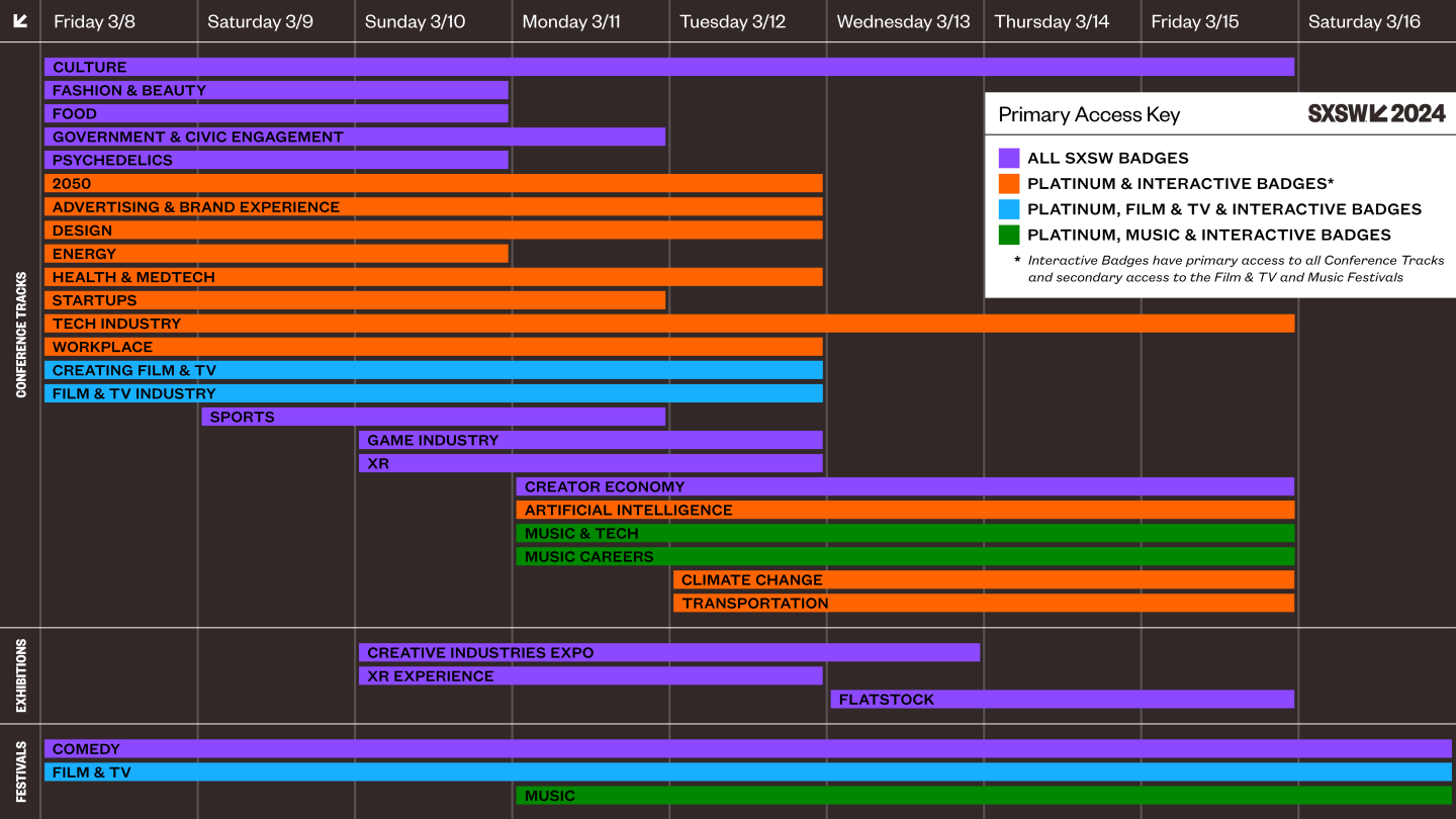 The SXSW Conference provides an opportunity for global professionals at every level to participate, network, and advance their careers. Explore all 24 tracks of programming across a variety of formats including Keynotes, Featured Speakers, panels, workshops, and more.