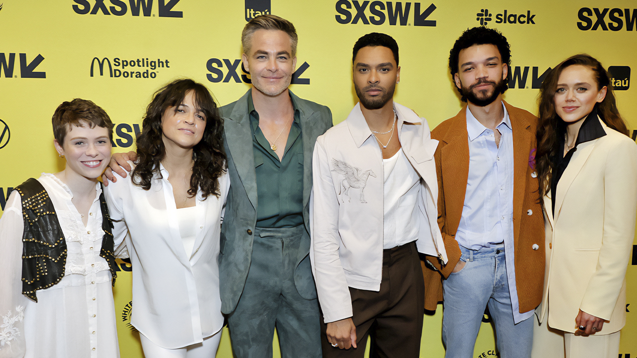(L-R) Sophia Lillis, Michelle Rodriguez, Chris Pine, Regé-Jean Page, Justice Smith and Daisy Head