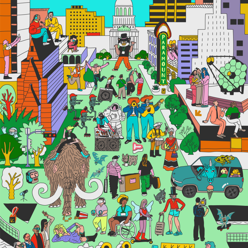 In partnership with Austin-based design firm Overstory and the inimitable Taiwanese-American illustrator, Josh Cochran our newly-revealed key art for 2026 comes to life, complete with decades of SXSW lore dotted onto an iconic stretch of Congress Ave; a cowboy riding a woolly mammoth, The UT Austin marching band and Artemis II astronauts next to a boisterous DJ booth and a barking robot dog. If you’ve attended SXSW before, you’ve experienced some of these fun, unexpectedly surreal interactions that have led to game-changing connections that sparked new ideas. The vibrant illustrations depict diverse creatives gathering in our incredible, reimagined downtown Austin landscape. SXSW 2026 marks our 40th year in our flagship city in Austin, and it's slated to be the most innovative experience yet.