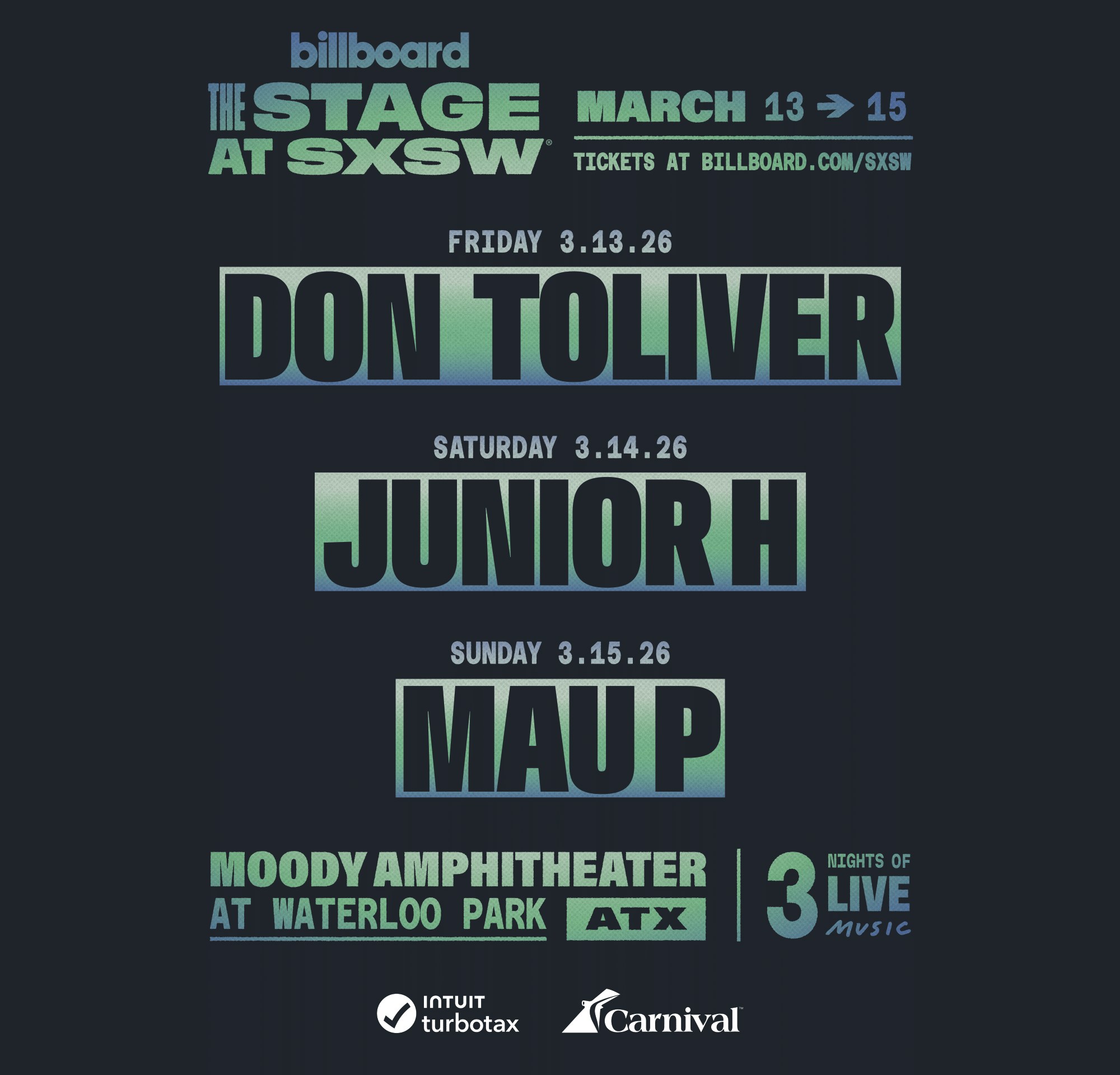 Amazing news! Billboard is returning to South by Southwest in Austin, TX again this year to present three electric nights of live music performances from Friday, March 13 through Sunday, March 15. Each night of the signature concert series will showcase a different musical genre, starting with R&B/hip-hop artist Don Toliver on Friday March 13 and Música Mexicana sensation Junior H on Saturday March 14. Closing out the proceedings on Sunday March 16, Carnival Cruise Line presents acclaimed Dutch-DJ and producer Mau P.