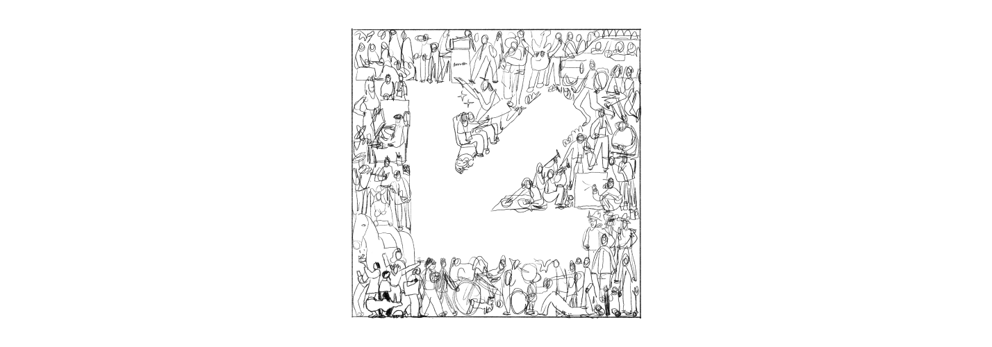 Josh Cochran: The art directors sent me previous identities and they were all very graphic. I was encouraged to just go hard, play with all different types of people, body types—you know, people wearing suits and then weirdos in cut-off jorts. I was sent some reference folders with images and I also looked through the archive. I spent a lot of time just combing through and trying to get a sense of South by Southwest because I’ve never been. And the more I looked, the more I understood what they were looking for, which was this kind of eclectic, wild, party-festival that’s happening in the streets and also in the buildings and all over Austin. It was a fun challenge to try to figure out how to mash everything together.